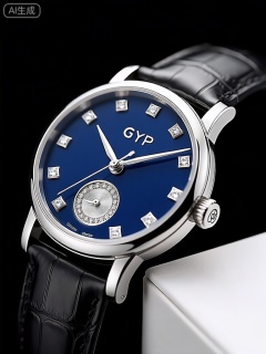 GYCP,此图像展示的是一款豪华手表的特写。手表的表壳由18K白金打造,经过精细的抛光处理,散发出耀眼的光芒,尽显高贵与奢华。表盘为深蓝色的珐琅材质,表面光滑如镜,上面镶嵌着12颗钻石作为时标,璀璨夺目。表盘中央有三根指针,分别是时针、分针和秒针,均为白金材质,表面经过镀铑处理,呈现出银白色的光泽。表盘下方有一个小秒盘,同样镶嵌着钻石,与主表盘相呼应。手表的表带采用黑色鳄鱼皮材质,纹理清晰,质感上乘,表带上的针扣也是白金材质,与表壳完美搭配。在手表的侧面,可以看到表冠,上面刻有品牌标志,细节之处尽显精致。图像右下方还能看到一个白色的展示盒一角,材质柔软,为手表提供保护。背景是纯黑色的,突出手表的精致与华丽。