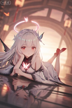 masterpiece,very aware,highres,absurdres,newest,best quality,petite,high quality,chromatic_aberration,cinematic_angle,dutch angle,photorealistic,//,artist:torino aqua,artist:rhasta,artist:wlop,artist:ke-ta,artist:hiten \(hitenkei\),//,khaos lv.2,1girl, long hair,red eyes, dress, white hair, gradient, halo,wings,red feet, looking at viewer, bangs, hair ornament, bare shoulders, very long hair,full body, flower,lying, parted lips, detached sleeves, barefoot, white dress, feet, official alternate costume, bare legs, toes, soles, bug, on stomach, butterfly, legs up, reflection, feet up, the pose,//,official art,depth of field,detailed light,blurry background,cinematic lighting,ray tracing,ultra detailed,god rays,backlighting,photo background,film grain,chromatic aberration,volumetric lighting,depth of field,blurry background,shiny skin,floating hair,cinematic lighting,day,very aesthetic,cowboy shot,look up,head wreath