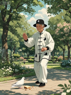 JBL,图像里呈现了一个老人在公园里打太极。他戴着一顶黑色的太极帽,帽檐上有一个小小的太极图案。他穿着一件白色的太极服,衣服上绣着黑色的太极图案,脚上是一双黑色的布鞋。他的动作缓慢而流畅,仿佛与周围的环境融为一体。一只白色的小鸽子在他的脚边悠闲地踱步,时不时地啄食着地上的面包屑。公园里的树木郁郁葱葱,花草繁茂,空气中弥漫着淡淡的花香。天空中飘着几朵淡淡的云彩,阳光透过树叶的缝隙洒在地上,形成一片片光影。整个场景充满了宁静与和谐的氛围,让人感受到身心的放松。