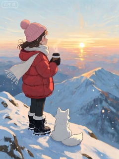 JBL,这幅图像描绘了一个年轻的女孩在山顶上看日出。她戴着一顶粉色的毛线帽,帽檐上有一个小小的毛球,显得十分可爱。她穿着一件红色的羽绒服,外面套着一件白色的围巾,脚上是一双黑色的雪地靴。她的手中拿着一杯热咖啡,正静静地欣赏着日出的美景。一只白色的小狐狸在她的脚边静静地趴着,时不时地抬头看看她。山顶上覆盖着一层厚厚的积雪,远处的天空渐渐泛起了鱼肚白,太阳慢慢地从地平线上升起,金色的阳光洒在雪地上,反射出耀眼的光芒。整个场景充满了浪漫与梦幻的气息,让人感受到大自然的神奇与美丽。