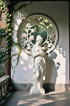 GYMX,画面里是一尊洁白的汉白玉雕像矗立在圆形镂空花窗前。花窗上雕刻着精美的花鸟图案,阳光透过花窗洒下,形成斑驳的光影。雕像是一位身姿婀娜的少女,她微微低头,手中似乎捧着一朵花,神情温柔而宁静。花窗左侧的墙是爬满爬山虎的砖墙,绿意盎然,右侧的墙壁是浅灰色的石墙,质感厚重。雕像和花窗的影子被印在地面和墙壁上,随着光线的变化而移动,给人一种时光流转的感觉,整个场景宛如一座静谧的园林中的艺术角落。