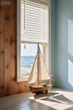GYMX,画面里是一艘木质的小帆船模型摆放在一扇狭长的窗户前。窗户上挂着白色的百叶窗,部分百叶窗被拉开,透出外面的光线。小帆船模型制作精巧,船帆高高扬起。窗户左侧的墙是浅棕色的木质墙板,有着自然的木纹,右侧的墙壁是淡蓝色的乳胶漆墙面,清新宜人。小帆船模型和窗框的阴影被印在地面和墙壁上,阳光从右上方斜照,在帆船上形成明暗层次,营造出一种宁静而悠远的航海氛围,仿佛让人置身于海边的小屋中。