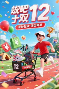 YYHB,该图像是购物活动的充满活力,丰富多彩的广告。在顶部,中文字符的大型大胆文字上写着“双12”,其下面的文字较小,说“运动狂欢,低价畅享”。背景具有广阔、明亮的蓝天,远处是连绵的青山,以及带有运动氛围的户外运动场。在前景中,一个动画运动员形象,在运动场上欢快地奔跑。他穿着一件红色的运动T恤,搭配黑色运动短裤和一双白色运动鞋,头戴一顶白色的运动帽。一个黑色的购物车,里面装满了各种运动户外产品,包括运动鞋、运动背包、帐篷和登山杖等。购物车的数字为“12”。角色和手推车周围是许多五颜六色的元素:带有大红色“¥”符号的绿色运动风购物袋,带有“¥”符号的红色和绿色气球的奖杯,心形、星形的运动徽章以及飘落的彩纸。在主文本的底部,有一个带有白色文字的红色横幅,上面写着“499减100”。整个场景是活跃而充满活力的,非常重视运动购物和享受户外生活的兴奋。