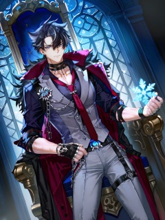 Wriothesley \(genshin impact\),<lora:碧蓝航线立绘12·ILL:0.8>,lihui,official alternate costume,1boy,sitting,male focus,solo,suit coat,jewelry,throne,suit,coat,shirt,pants,looking at viewer,chair,snowflakes,necklace,(quasarcake:0.7),dutch angle,from_side,(cowboy_shot:1.2),