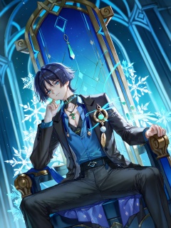wanderer \(genshin impact\),short hair,<lora:碧蓝航线立绘12·ILL:0.8>,lihui,official alternate costume,1boy,sitting,male focus,solo,suit coat,jewelry,throne,suit,coat,shirt,pants,looking at viewer,chair,snowflakes,necklace,(quasarcake:0.7),dutch angle,from_side,(cowboy_shot:1.2),