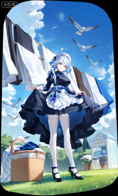 white pantyhose,official alternate costume,maid headdress,maid,laundry basket,pantyhose,breasts,apron,black footwear,white apron,dress,outdoors,sky,black dress,frills,day,blue sky,grass,looking at viewer,laundry,maid apron,full body,white hair,long sleeves,cloud,standing,high heels,basket,large breasts,long hair,shoes,transparent background,frilled apron,bird,from_below,belfast \(azur lane\),66,