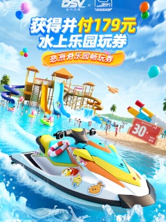 DSKV,该图像是一个洋溢着欢乐氛围的广告,具有水上乐园主题。一辆色彩鲜艳的水上摩托艇在碧波荡漾的湖面上飞驰。摩托艇上挂着游泳圈,车把上绑着防水相机,车身上贴着可爱的水上动物贴纸。在背景中,有高大的水滑梯,热闹的造浪池,还有在水中嬉戏的人群。天空中飘着几只水上气球,湖边的沙滩上有一个巨大的水枪形状的优惠券模型。在图像的顶部,中文中有大型大胆的文字,翻译为“付179元并获得35元的水上乐园畅玩券”。整体风格既清凉又充满欢乐,具有3D卡通设计。