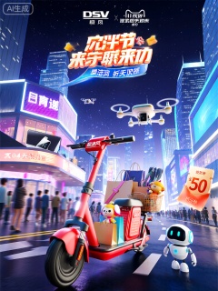 DSKV,该图像是一个热烈的节日促销广告,具有城市夜景主题。在前景中,一辆红色的电动滑板车穿梭在繁华的街道上。滑板车的把手上挂着“极速风”的标志。滑板车上载有各种购物袋,包括时尚服饰、电子产品和车篮里的卡通玩偶。在背景中,有高楼大厦、霓虹灯和璀璨的星空,街道上人群熙熙攘攘。无人机在空中盘旋,展示着促销信息,街道旁有一个巨大的折扣券模型和一个小型机器人。整体风格既现代又充满活力,具有3D卡通设计。