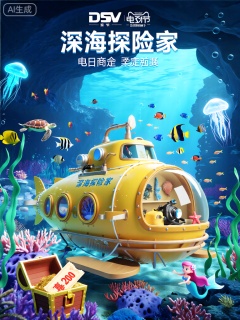 DSKV,该图像是一个创意十足的电商节日广告,具有海底世界主题。在前景中,一辆黄色的潜水艇在五彩斑斓的珊瑚礁中穿梭。潜水艇的舱门上写着“深海探险家”。潜水艇内装有潜水装备、海洋生物标本和窗边的海星玩偶。在背景中,有各种各样的热带鱼、海龟和神秘的海底洞穴,还有发光的水母在游动。海草在水中摇曳,海底有一个巨大的优惠券宝藏箱和一个小型美人鱼。整体风格既奇幻又美丽,具有3D卡通设计。