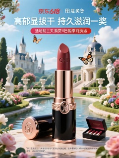 CPHB,该图像是高端口红产品的广告。这款口红以精致的圆柱形金属外壳呈现,外壳采用玫瑰金与黑色搭配,尽显奢华质感,顶部轻轻旋转即可露出膏体,且外壳侧面带有品牌精致的浮雕标志。口红膏体颜色浓郁丝滑,色泽饱和度高,有着如丝绸般的光泽,暗示着“高级显色”与“丝绒柔滑”的特质。背景以梦幻的欧式宫廷花园为特色,其中有繁花似锦的花坛、精美的白色雕像,与远处巍峨的城堡和湛蓝如宝石般的天空相互映衬。花园中还有潺潺的流水和飞舞的蝴蝶,营造出浪漫而优雅的氛围。图像中的文字包括用于京东618大促的促销信息,突出显示了诸如“浓郁显色不拔干”“持久滋润一整天”之类的功能,以及活动前三天购买享有的特殊优惠,其中包括口红替换芯和定制的口红收纳盒。总体设计结合了欧式宫廷奢华美学的元素以及现代高端口红的精致呈现。