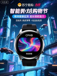 CPHB,该图像是智能手表产品的广告。这款智能手表以时尚的圆形表盘呈现,表盘采用黑色陶瓷材质,搭配银色金属边框,显得科技感十足。表盘内部是一块高清的彩色触摸屏,屏幕显示清晰细腻,有着丰富的色彩和流畅的动画效果,暗示着“智能便捷”与“高清显示”的特性。背景以未来感十足的科技城市为特色,其中有高耸入云的玻璃大厦、闪烁着霓虹灯光的飞行汽车,与悬浮在空中的交通轨道和璀璨的星空相互交织。城市中弥漫着淡淡的蓝色光芒,营造出神秘而先进的氛围。图像中的文字包括用于苏宁易购818发烧购物节的促销信息,突出显示了诸如“精准健康监测”“超长续航能力”之类的功能,以及活动当天购买享有的特殊优惠,其中包括手表表带和运动耳机。总体设计结合了未来科技美学的元素以及现代智能手表的时尚呈现。