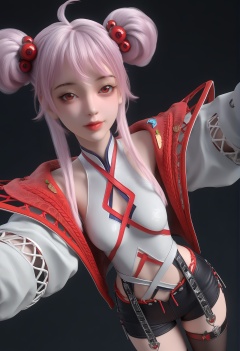 (score_9),<lora:炙珠-apony-000009:0.85>,zizhu,1girl,solo,red eyes,double bun,hair ornament,pink hair,ahoge,open jacket,sleeveless topwear,puffy sleeves,short shorts,single thighhigh,thigh strap,(single_thighhigh),tassel,mature_female,collarbone,BREAK<lora:Expressive_H-000001:0.8>,light blush,Expressiveh,looking at viewer,front view,dutch angle,dynamic_angle,from above,selfie,v sign,closed mouth,<lora:e肤色滑块:0.25>,fair_skin,(pale skin),ultra-detailed skin texture,detailed textures,<lora:皮肤凹痕:1.2>,<lora:RealisticSkinv1_ponyv6_loraplus:0.3>,real skin,BREAKsimple background,black background,<lora:e色温:0.25>,4K ultra HD,sharp focus,high detail,high contrast,