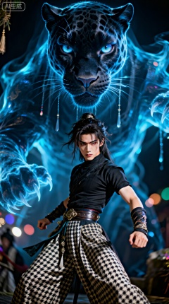 超写实写真摄影,东方美学,强烈的明暗对比,超高清,垂坠感,清冷感,面部特写,最高画质,远景特写呈现出巨大黑豹幽灵虚影幻化蓝色超亮质感,呈现神秘法相形态,超极致细节效果感,眼部瞳孔极致细节细腻视觉效果感,随机生成人物动作姿态变化视觉效果感,随机生成环境场景视觉效果感,真实质感视觉效果, 近景为东方美学人物cos,强烈的明暗对比,超高清,垂坠感,清冷感,透射,景深,自由构图,光影交错,帅哥,冷酷,高细节,凌乱的头发, 腰封,皮带,繁复穿搭,黑色紧身短袖,阔腿休闲千鸟格印花长裤,随机动作,柔焦处理的高斯模糊效果,明暗交错的戏剧性光影,虚实结合的构图张力,35mm胶片模拟,大光圈浅景深,档曝光补偿控制暗部细节,双色温闪光灯布光,背景光斑虚化处理,彩色光斑,高质量,写实逼真,艳丽色彩,真实人物比例,细腻渲染,比例9:16。