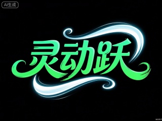 BTZT,图像以黑色背景衬托出中文字符“灵动跃”。文字采用鲜绿色,笔触轻盈飘逸,仿佛每一笔都在跳跃。围绕文字的是由白色和浅蓝色组成的动态光效,它们以波浪形和螺旋形交织,为设计增添了无限动感。黑色背景与文字的鲜明色彩形成强烈反差,使得整个设计既简洁又充满活力。