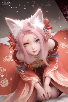score_9,score_8_up,score_7_up,1girl,solo,looking at viewer,long hair,blue eyes,hair ornament,bare shoulders,wide sleeves,red dress,dress,jewelry,yellow eyes,pink hair,hair flower,animal ear fluff,fox ears,heterochromia,facial mark,veil,facing viewer,faceoff,bed,flower,petals,(fetal_position:1.3),from above,fetal_position,fetal_position