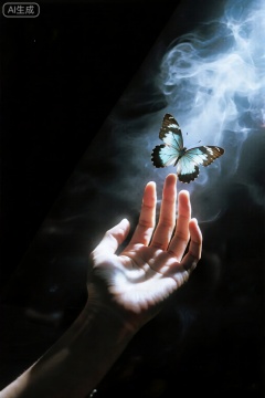 画面营造出一种神秘而唯美的氛围。深沉的暗调背景中,弥漫着淡淡的烟雾,增添了朦胧之感。一束光线从上方或侧方洒下,照亮了一只手和一只蝴蝶。 手位于画面下方,掌心向上,手指自然伸展,姿态轻柔且充满善意,仿佛在温柔地托举或迎接蝴蝶。手部肌肤在光线的勾勒下,呈现出柔和的轮廓与细腻的质感。 一只蝴蝶停在手指上方,翅膀轻薄透明,纹理清晰可见,在光线的映照下泛着微光,宛如一件精致的艺术品。蝴蝶的存在为画面增添了灵动与生机,使其充满诗意。 整体画面通过光影、烟雾与主体的巧妙结合,传递出一种宁静、温柔且略带梦幻的情感,仿佛在诉说人与自然间微妙而美好的联系,令人心生向往。