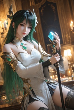 score_9,score_8_up,score_7_up,best quality,masterpiece,3d,ultra-detailed,high resolution,perfect lighting,flawless skin,sharp focus,Exquisite Craftsmanship,High-Resolution Beauty,Unparalleled Artistic Quality,extremely detailed CG unity 8k wallpaper,1girl,solo,<lora:林紫玥-药师白装:0.7>,bare shoulders,black hair,detached sleeves,dress,gem,green hair,hair ornament,long hair,looking at viewer,thighhighs,white dress,