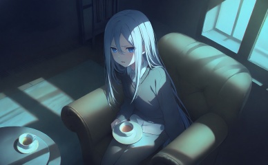 masterpiece,highres,absurdres,newest,best quality,loli,petite,high quality,chromatic_aberration,//,yoisaki_kanade, 1girl, long_hair, cup, blue_eyes, solo, sitting, chair, teacup, sweater, indoors, hair_between_eyes, table, shirt, collared_shirt, light_blue_hair, white_shirt, black_sweater, looking_at_viewer, very_long_hair, long_sleeves, armchair, couch, carpet, grey_sweater, straight_hair, blue_hair, parted_lips, saucer, white_hair, tea, holding_cup, shade, grey_hair, open_mouth, shadow, television, sidelighting, on_chair, tsurime, sidelocks, double-parted_bangs, furrowed_brow, window_shade, buttons, backlighting, dress_shirt//,<lora:PJSKcg925——【NOOB】hans:0.8>,