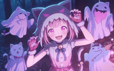 masterpiece,highres,absurdres,newest,best quality,loli,petite,high quality,chromatic_aberration,//,1girl, pink_eyes, pink_hair, gloves, bell, pink_gloves, fur_trim, pink_dress, open_mouth, fur-trimmed_gloves, solo, leaf, dress, bow, jingle_bell, smile, nature, star_\(symbol\), neck_bell, fingerless_gloves, tree, ootori_emu, animal_ears, paw_gloves, forest, tail, shirt, cat_ears, upper_body, looking_at_viewer, night, ribbon, buttons, animal_hands, short_sleeves, collar, cat_tail, sleeveless, dot_nose, frills, hands_up, short_hair, :d, belt, choker, outdoors, tail_ornament, pink_belt, fur-trimmed_dress, paw_pose, fake_animal_ears, claw_pose, ghost_costume, collared_shirt, white_shirt, blue_bow, pink_bow, hat, pink_choker, glowing, arms_up, blush, pink_ribbon, hood_up, pink_theme, sleeveless_dress, v-shaped_eyebrows, fingernails, bob_cut, light_particles, medium_hair, hood, animal_hat, >_<, official_alternate_costume, tail_bell//,<lora:PJSKcg925——【NOOB】hans:0.8>,