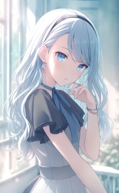 masterpiece,highres,absurdres,newest,best quality,high quality,chromatic_aberration,//,1girl,solo,jewelry,long_hair,neck_ribbon,blue_eyes,hairband,earrings,ring,short_sleeves,parted_lips,upper_body,black_hairband,blurry_background,bracelet,yoisaki_kanade,wavy_hair,backlighting,looking_at_viewer,blurry,ribbon,swept_bangs,light_blue_hair,dress,railing,window,hand_up,blue_nails,blue_hair,pearl_earrings,lace_trim,official_alternate_hairstyle,grey_nails,lace-trimmed_sleeves,depth_of_field,dot_nose,fingernails,bloom,day,choker,blue_ribbon,light_particles,grey_ribbon,lace,frilled_sleeves,bokeh,//,<lora:PJSKcg925——【NOOB】hans:0.8>,