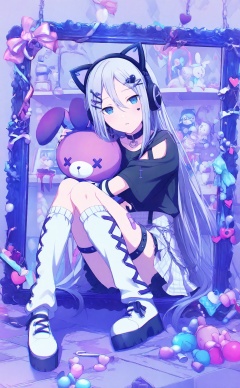 masterpiece,highres,absurdres,newest,best quality,loli,petite,high quality,chromatic_aberration,//,yoisaki_kanade, animal_ear_headphones, cat_ear_headphones, 1girl, picture_frame, fake_animal_ears, long_hair, shoulder_cutout, solo, animal_ears, headphones, blue_eyes, sitting, heart, very_long_hair, stuffed_toy, x_hair_ornament, official_alternate_costume, cross-laced_clothes, hair_ornament, purple_theme, stuffed_animal, clothing_cutout, socks, shirt, short_sleeves, looking_at_viewer, skirt, choker, black_shirt, leg_warmers, plaid, platform_footwear, fingerless_gloves, hairclip, cross-laced_legwear, black_choker, paw_print, flower, hair_between_eyes, curtains, white_hair, thigh_strap, teddy_bear, cross-laced_sleeves, bow, gloves, bag, stuffed_cat, cat_ears, full_body, chain, double-parted_bangs, pink_flower, loose_socks, striped_clothes, striped_socks, knees_together_feet_apart, sidelocks, loaded_interior, indoors, shoes, pleated_skirt, heart_hair_ornament, broken_heart, white_socks, knees_up, portrait_\(object\), o-ring_thigh_strap, parted_lips, arm_warmers, heart_print, footwear_bow, grey_hair, mirror, pearl_\(gemstone\), white_footwear, heart_facial_mark, white_gloves, kneehighs, pendant_choker, dot_nose, plaid_skirt, collar, collarbone, cross-laced_footwear, pink_bow, on_floor, rose, jewelry, straight_hair, blue_theme, mannequin, bandaid, o-ring, black_footwear, pink_rose, frills, white_skirt, nail_polish, blue_flower, black_collar, light_blue_hair, bandaid_on_arm, candy, vase, painting_\(object\), heart_cutout, photo_\(object\), stuffed_rabbit, red_flower, wooden_floor, star_\(symbol\), bell//,<lora:PJSKcg925——【NOOB】hans:1>,