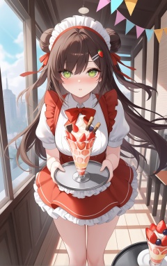 msk,CG rendering,ka ra ra ge tsu ne,gwwj,key999,masterpiece,best quality,very aesthetic,extremely delicate and beautiful,huge filesize,amazing quality,32K UHD,ultra-detailed,photorealistic skin,depth of field,8k,(sheya:0.4),(Qiandaiiu:0.3),(koahri:0.4),sexy,(MeIoN:0.4),(wumai:0.4),(ssr:0.7),(SG:0.9),(netural:0.6),(Fungi:0.3),(ABPART:0.8),(D. I .S.H:0.6),(sorananiiro:0.4),(san:0.3),((eichi)_nagatochi:0.9),mature_female,(torino:0.2),glamor,wallpaper,cosplay,cinematic_angle,real,(by Devilworld:0.3),clear,cute,bishoujo,kawaii,nsfw,newest,latest,(hitokomoru:0.4),(miyuki:0.8),beautiful detailed eyes,beautiful detailed lips,extremely detailed eyes and face,delicate features,graceful pose,ethereal atmosphere,soft lighting,enchanting,illustration,anime style,vivid colors,sharp focus,professional,extreme detail description,ZX light,masterpiece,best quality,very aesthetic,extremely delicate and beautiful,Noise and grain,huge filesize,amazing quality,foreshortening,cinematic_angle,//,1girl, food, brown hair, solo, holding, green eyes, double bun, long hair, fruit, hair bun, strawberry, looking at viewer, maid headdress, waitress, tray, short sleeves, indoors, skirt, polka dot, red skirt, hair ornament, blush, shirt, window, bag, holding food, holding tray, ribbon, white shirt, wooden floor, floating hair, puffy short sleeves, puffy sleeves, bow, hairclip, frills, hair ribbon, day, parfait, pennant, standing