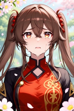 hu tao \(genshin impact\), crying, brown hair, solo, tears, long hair, crying with eyes open, flower-shaped pupils, twintails, sad, upper body, petals, blurry, shirt, parted lips, flower, outdoors, blurry background, symbol-shaped pupils, brown eyes, red shirt
