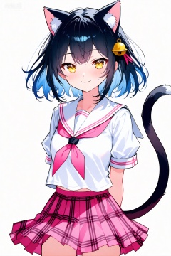 1girl, animal ears, solo, skirt, tail, bell, pink skirt, yellow eyes, cat ears, cat tail, neck bell, short sleeves, black hair, plaid, smile, school uniform, sailor collar, plaid skirt, shirt, white shirt, looking at viewer, white sailor collar, cat girl, closed mouth, blush, short hair, collar, neckerchief, puffy sleeves, animal ear fluff, white background, jingle bell, pleated skirt, blue hair, multicolored hair, puffy short sleeves, serafuku
