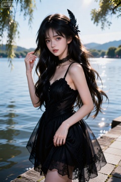 3. 关键元素:CG厚涂风格,伦勃朗光突出轮廓,电影级面光1.6,光线追踪1.4,冷白皮漫感光滑皮肤1.6,发丝光1.4,骨相精致度1.2,网感脸1.6,网感妆1.6。长发及腰、洋娃娃般的女生,身着黑色纱质哥特裙(外层纱料绣满暗纹,内搭黑色吊带),发间插着黑色羽毛发饰,衣服与发饰细节繁复。黑长卷发蓬松,大眼睛含爱意,在杭州西湖边漫步。