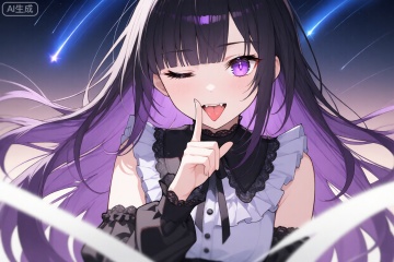 Long hair, black hair, purple gradient hair, purple eyes, blunt bangs, hair over one eye, glowing eyes,