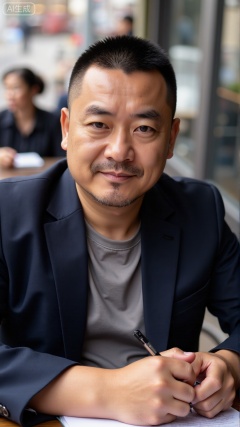 DYMAN, A 37-year-old man with neat short hair, dressed in a dark, tailored blazer over a plain tee, sitting at an outdoor café table with a book in one hand and a pen in the other, pausing to nod at a passing neighbor—calm in his posture and a thoughtful spark in his eye, permeated with a composed, approachable masculinity