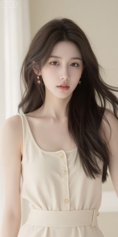 XY, A young woman,hyperrealistic portrait,with long,flowing,dark brown hair. Soft,natural light illuminates her face,casting subtle shadows. Her skin is smooth and porcelain-like,with light peachy tones. She is wearing a simple,cream-colored linen sleeveless dress,with visible texture and subtle creases. The dress has a scoop neckline and a front closure with small,button-like details. The woman's posture is relaxed and engaging. She has delicate,light-colored earrings with a floral or leaf design. The background is a soft,off-white and subtle cream. The lighting is soft and diffused,creating a gentle,airy atmosphere. Focus on the face and shoulders. Slight bokeh effect.,