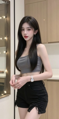 XY, This photograph depicts a young woman from East Asia. She has long, black hair that is straight in style; she is wearing a tight-fitting, gray crop-top that accentuates her moderately sized breasts; she also paired this top with a pair of black shorts, which further highlight the curves of her hips. The setting in the photo is a modern kitchen: the cabinets are beige in color, and the countertops are white; on the left side of the kitchen, there is a mirror adorned with string lights. The woman’s lips are painted in a bright red color, and her facial expression appears very natural and peaceful.