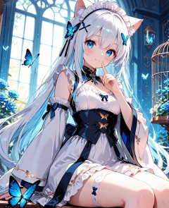 O,1girl, butterfly, blue butterfly, bug, solo, cage, long hair, birdcage, finger to mouth, animal ears, blue eyes, looking at viewer, hair ornament, breasts, dress, bangs, blush, flower, white hair, blue flower, white dress, indoors, hair between eyes, maid headdress, index finger raised, blurry, wide sleeves, multicolored hair, holding, x hair ornament, frills, very long hair, blue hair, cat ears, jewelry, long sleeves, medium breasts, Negative prompt: ((nsfw)),sketches,tattoo,(beard:1.3),(EasyNegative:1.3),badhandv4,(Teeth:1.3),(worst quality:2),(low quality:2),(normal quality:2),lowers,normal quality,facing away,looking away,text,error,extradigit,fewerdigits,cropped,jpegartifacts,signature,watermark,username,blurry,skinspots,acnes,skinblemishes,badanatomy,fat,bad feet,cropped,poorly drawn hands,poorly drawn face,mutation,deformed,tilted head.bad anatomy.bad hands,extra fingers,fewer digits.,extra limbs.extra arms,extra legs,malformed limbs.fused fingers.,too many fingers,long neck,cross-eyed,mutated hands,bad body,bad proportions,gross proportions,text,error,missing fingers,missing arms,missing legs,extra digit,extra arms,extra leg,extra foot,missing fingers,nsfw,,nsfw, Steps: 25, Sampler: DPM++ 2M Karras, CFG scale: 7.0, Image CFG scale: 1.5, Seed: 865074496, Size: 1040x1280, Model hash: 9fefdb2c24, Model: 我大多数_1.0.safetensors, Denoising strength: 0.4, Clip skip: 2, RNG: CPU, Mask blur: 4, Lora 1: 动漫二次元眼睛刻画(基础XL), Lora Hash 1: 488bf17588, Lora Weight 1: 0.8, Lora 2: 二次元厚涂风格模型, Lora Hash 2: 571eba0c12, Lora Weight 2: 0.6, Lora 3: 二次元动漫细节加强, Lora Hash 3: 600d97257e, Lora Weight 3: 0.3, Lora 4: Xian-T手部修复lora(不用controlnet也不坏手了), Lora Hash 4: 4ec9e988a2, Lora Weight 4: 1.0, Lora 5: 润光A, Lora Hash 5: 93bf4ab238, Lora Weight 5: 0.2, vae_name: automatic