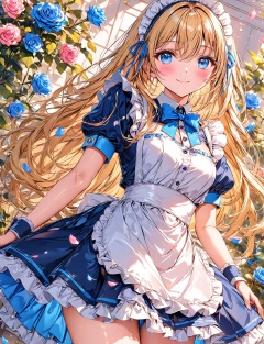 O,Full head,1girl, solo, blonde hair, flower, blue eyes, long hair, rose, apron, looking at viewer, maid headdress, bow, short sleeves, frills, blush, bangs, blue bow, wrist cuffs, puffy sleeves, maid, dress, smile, blue flower, pink flower, breasts, closed mouth, puffy short sleeves, cowboy shot, bowtie, medium breasts, skirt, hair between eyes, pink rose, white apron, blue bowtie, shirt, blue skirt, frilled dress, maid apron, blue dress, blue rose, standing, frilled apron, white shirt, very long hair, yellow bow, petals,(UHD),anatomically correct,accurate,textured skin,super detail,high details,award winning,best quality,high quality,retina,HD,16k,1080P,