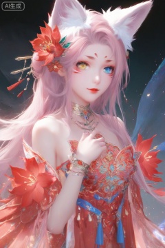 score_9,score_8_up,score_7_up,1girl,solo,looking at viewer,long hair,blue eyes,hair ornament,bare shoulders,red dress,jewelry,yellow eyes,pink hair,hair flower,animal ear fluff,fox ears,heterochromia,facial mark,veil,facing viewer,faceoff,hand,breasts, (wrist:1.3),upper body,legs,hand up