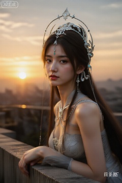 千问佳人,真人美女摄影,天台夕阳下,一位身材火辣的女孩坐在水泥护栏上,穿着吊带裙,逆光勾勒出迷人的身体曲线和发丝光,背景是金色晚霞。镜头参数:尼康58mm f/1.4G, f/2.0, 1/500s, ISO 200。小红书情绪大片风,电影感,黄金时刻。