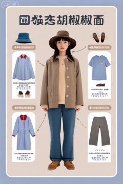 照片中央站着一名年轻女子,她穿着一件时髦的衣服:浅棕色外套、米色卫衣、蓝色裤子和棕色鞋子。她戴着一顶宽边帽。在她周围有四个区域,分别被标记为“换季服装”和“换季鞋子”。每个部分都包含各种服装和配饰。在“胡椒椒面”部分,左上角有一顶蓝色的水桶帽。一件浅蓝色衬衫,红领,扣子在左下角。一件浅蓝色连衣裙,红领,扣子在左下角。一件浅蓝色的t恤,右上方有一个小图案。右下角有一双棕色的鞋子。,有:右下方有一双棕色的鞋子。左下角是一双白色鞋底的棕色鞋子。右下角是一双白色鞋底的棕色鞋子。左下角是一双白色鞋底的棕色鞋子。背景是浅米色和浅蓝色的柔和渐变,创造了一个平静而中性的背景,突出了女人和衣服。形象的整体风格是干净和现代的,重点是服装和配饰。,信息表