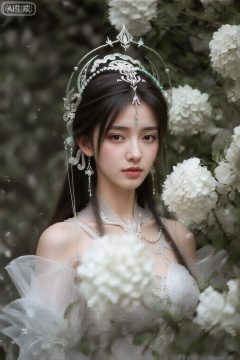 一位宛如精灵的少女隐没在一片盛放的白色绣球花丛中。她戴着野花编织的花环,穿着飘逸的白色蕾丝长裙,眼神纯真带着一丝神秘。画面柔美,色调清新,前景有虚化的花瓣,空中有细微的尘埃在光线中飞舞。(镜头参数:适马Art 105mm f/1.4, f/2, 1/320s, ISO 100)