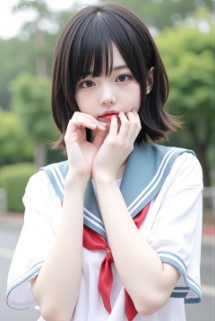 1girl,solo,looking at viewer,short hair,shirt,black hair,closed mouth,school uniform,white shirt,upper body,short sleeves,outdoors,day,serafuku,hand up,blunt bangs,sailor collar,blurry,black eyes,neckerchief,lips,blurry background,depth of field,bob cut,blue sailor collar,red neckerchief,realistic,red lips,asian