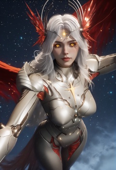 (score_9),cowboy shot,standing,<lora:星幻王-apony-000009:0.83>,mechanical angel,xinghuanwang,1girl,solo,joints,ringed eyes,long eyelashes,freckles,hair ornament,long hair,white hair,glowing markings,glowing eyes,yellow eyes,Metallic horn-like ornament,blending feathers and mechanical parts,power armor,shoulder armor,wings,feathered wings,red wings,large_wings,legs,cybernetic legs,calf,glowing veins on calf,lower leg,cybernetic calf,mature_female,BREAK<lora:Expressive_H-000001:0.78>,light blush,Expressiveh,ringed eyes,looking at viewer,front view,dutch angle,dynamic_angle,from above,selfie,v sign,closed mouth,fair_skin,(pale skin),(sweaty_skin),BREAKsimple background,<lora:e色温:0.25>,sparkle,blurry background,star \(symbol\),starry sky,star \(sky\),universe,hyper_galaxy,4K ultra HD,sharp focus,high detail,high contrast,