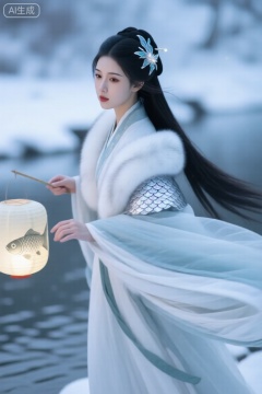 古风。画面定格,渲染,色彩搭配。氤氲,层次感,脸部局部有亮晶晶闪闪的鱼鳞片,鱼鳞片发饰发簪,发光粒子,穿貂毛汉服。裙摆飞舞。水波,拿着鱼灯。水岸。积雪。头发与服饰轮廓,整体风格清新,精致,朦胧,唯美,清冷少女,梦幻,符合场景的动作