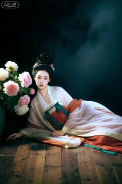 画面中央,古典风。色彩饱满有层次,高清,五官精致,妆容精致,身姿曼妙的年轻古代美女,汉服,汉代高发髻,木质地板上,古代美女穿着漂亮的汉服,慵懒的斜靠在牡丹花丛下,细节丰富,伦勃朗光,深色冷色调背景, 梦幻感。故事感,落寞氛围,朦胧,梦幻,神秘感