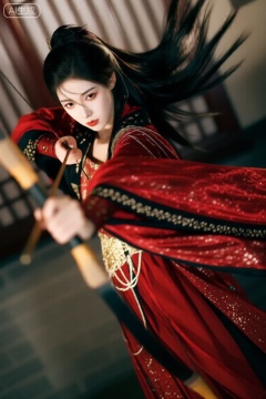 华丽古风人物俯瞰角度,动感构图,时间凝固瞬间,戏剧化场面人物特写,带有黄金色调点缀, 主题暧昧,隐隐约约的模糊古装美女人像,红衣,飒爽,手持弓箭纷飞的头发,俊美,杀气,失控,动态模糊,边沿模糊, 绸缎光泽的墨色长发,繁复褶皱+华丽饰品和纹理衣服材质:丝绒,丝绸,提花,珠光纱。 宫墙背景。
