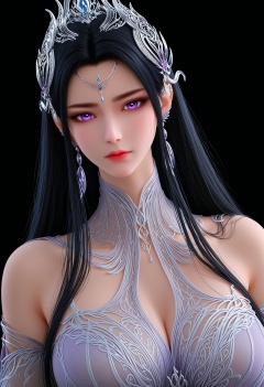 score_9,looking_at_viewer,upper body,(huge breasts:0.5),yechangong,solo,1girl,black hair,long hair,hair ornament,jewelry,earrings,expressionless,closed mouth,dress,purple eyes,white dress,(purple dress:1.1),bare shoulders,detached collar,tiara,(see-through:0.8),(simple background,pure black background,black background:1.1),perfect_anatomy,<lora:QQSponyyechangongV1:0.8>,