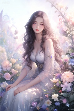 muse xyyx,masterpiece, best quality, 1 beautiful girl with long wavy hair sits in a surreal garden of glowing flowers, ethereal, soft fantasy, art by Rossdraws and wlop, intricate details, luminous pastel colors, dreamy atmosphere, soft light, cinematic lighting, 8k resolution