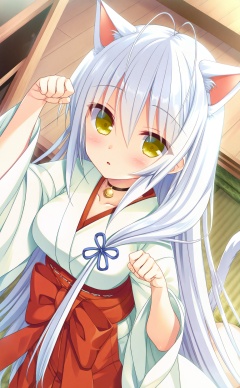 masterpiece,highres,absurdres,newest,best quality,loli,petite,high quality,chromatic_aberration,//,umino_miyako, 1girl, animal_ears, cat_ears, miko, long_hair, solo, japanese_clothes, tail, white_hair, cat_tail, bell, paw_pose, yellow_eyes, dutch_angle, hakama_skirt, hakama, neck_bell, looking_at_viewer, red_hakama, skirt, choker, antenna_hair, jingle_bell, hair_between_eyes, kimono, breasts, wide_sleeves, ribbon, very_long_hair, white_kimono, cat_girl, collarbone, long_sleeves, parted_lips, indoors, medium_breasts, extra_ears, hair_ribbon//,<lora:umino_miyako——【noob】hans:1>,