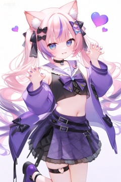 1girl, animal ear fluff, animal ears, belt, bow, cat ears, cat girl, claw pose, crop top, hair bow, hair ornament, heart, jacket, long hair, looking at viewer, multicolored hair, pink hair, purple eyes, purple hair, purple jacket, purple nails, purple skirt, sailor collar, simple background, skirt, smile, solo, streaked hair, thigh strap, twintails, virtual youtuber, white background