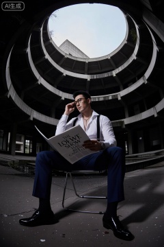 男袜,男性写真,在废弃的圆形建筑内部,男子呈现出优雅又具气场的姿态:他坐在一把简约的金属椅子上,上身穿着白色衬衫(领口微敞,搭配黑色背带,增添了几分复古与干练感),下身是深蓝色长裤,脚上踩着黑色亮面皮鞋与黑色袜子,整体穿搭精致且富有格调,他手持一份印有"THE LOEWE SHOW HAS BEEN CANCELLED" 字样的报纸,一只手轻扶眼镜,神情沉静,仿佛沉浸在阅读中,背景是建筑内部裸露的混凝土结构,圆形的穹顶与层叠的环形梁架极具视觉冲击力,顶部的天光洒落,营造出冷峻又高级的工业风氛围,光线采用了明暗对比强烈的硬光,突出人物的轮廓与建筑的结构感,构图以低角度鱼眼镜头仰拍,强化了空间的纵深感与人物的气场,整体风格偏向"时尚杂志的男性力量感大片",传递出沉稳,精致且充满格调的男性魅力,