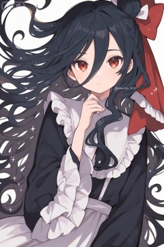 1girl,solo,long hair,looking at viewer,bangs,simple background,black hair,red eyes,long sleeves,white background,dress,bow,hair between eyes,very long hair,closed mouth,upper body,hair bow,frills,hair bun,twitter username,black dress,red bow,sparkle,wavy hair,white bow,